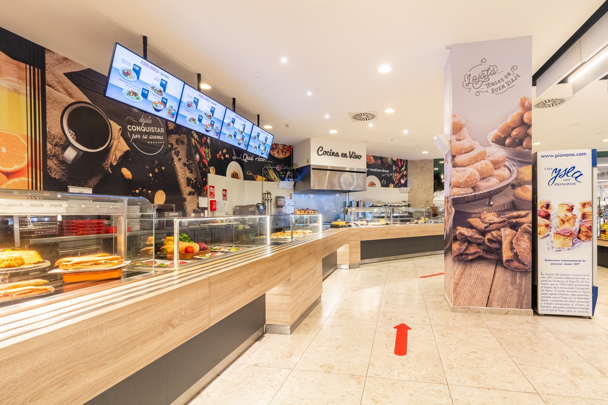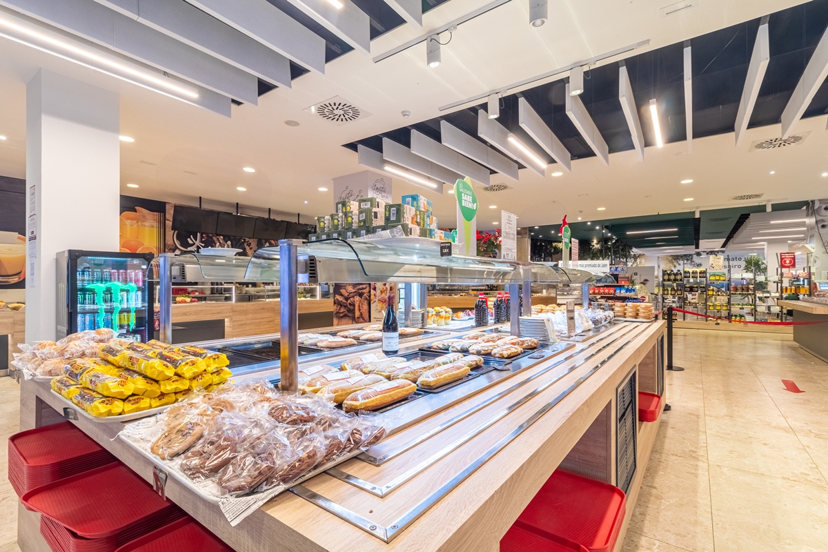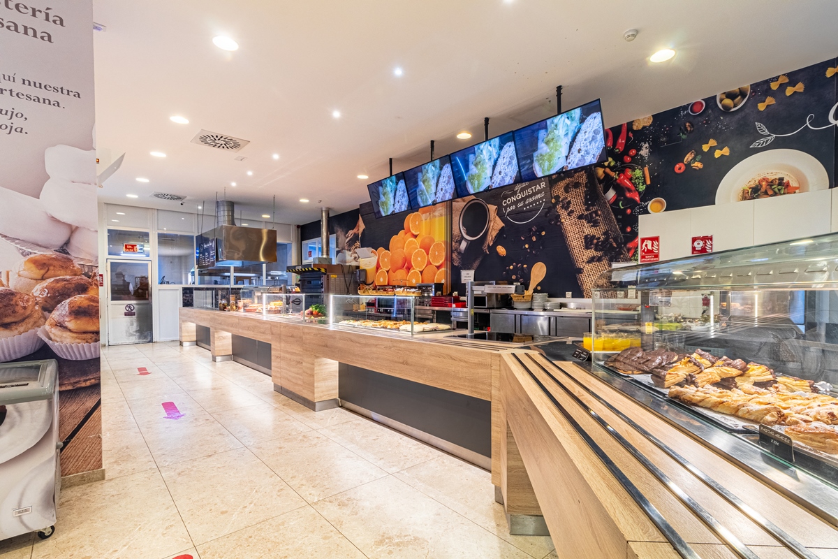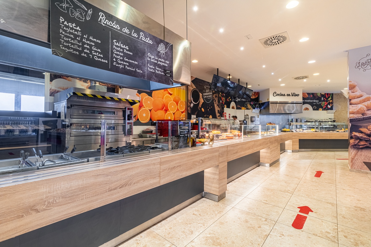 En su interior encontramos una zona de cafetería y zona self service con una variada propuesta gastronómica. Destaca la zona de pastelería y productos típicos, donde podremos encontrar delicias para degustar in situ o para llevar a nuestros amigos y familiares.